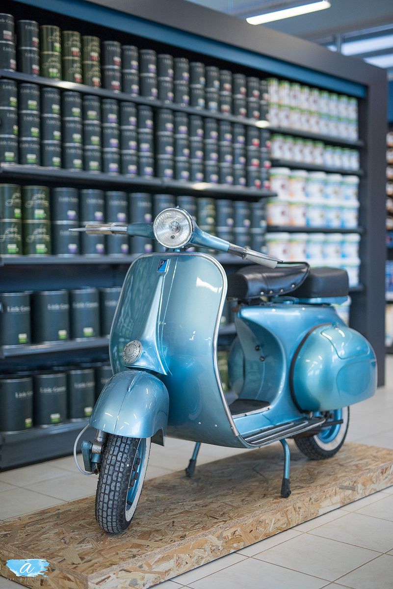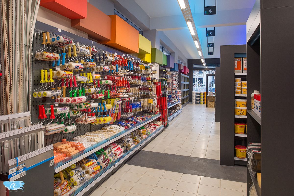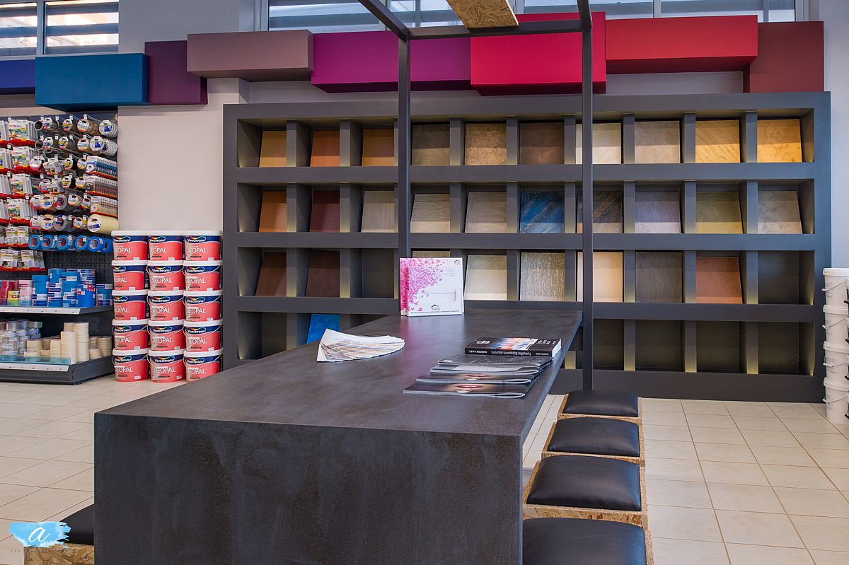 Στον εσωτερικό και στον εξωτερικό χώρο, δημιουργήθηκαν όγκοι-επιφάνειες με ιδιαίτερους χρωματισμούς και τεχνοτροπίες οι οποίες έχουν στόχο να ενημερώνουν τους πελάτες για τα καινούργια υλικά και τις τελευταίες τάσεις των χρωμάτων.
