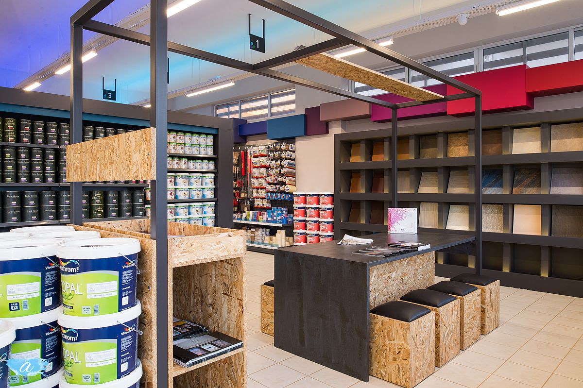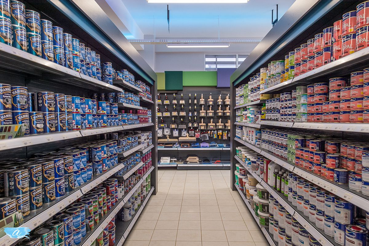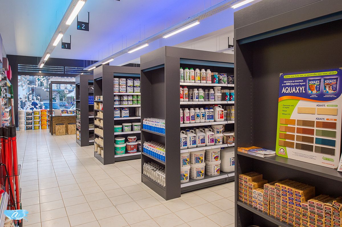 Για την προβολή και αποθήκευση των προϊόντων χρησιμοποιήθηκαν εργοστασιακά ράφια βαρέως τύπου, τα οποία επενδύθηκαν με κουτιά από μελαμίνη και ξύλο προκειμένου να εναρμονιστούν με τον εσωτερικό σχεδιασμό.