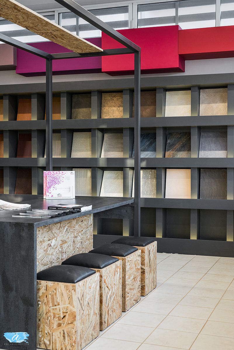 Επιπλέον σε ειδικά διαμορφωμένο σημείο με κατάλληλο φωτισμό βρίσκεται μια κατασκευή με τραπέζι και καθίσματα όπου οι πελάτες μπορούν να εμπνευστούν από έντυπο υλικό ή να ενημερωθούν από το προσωπικό του καταστήματος για την επιλογή ή την εφαρμογή των υλικών.