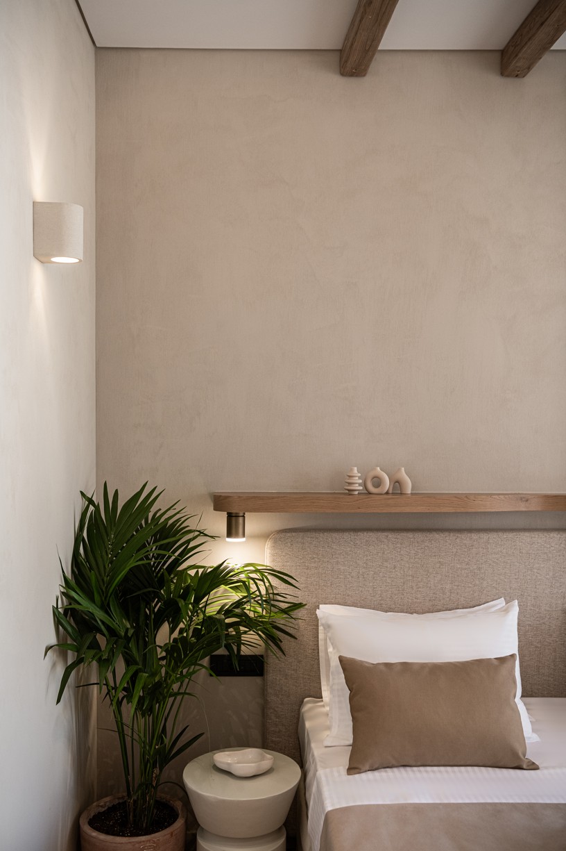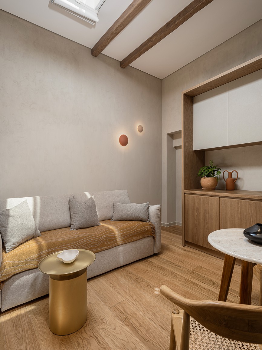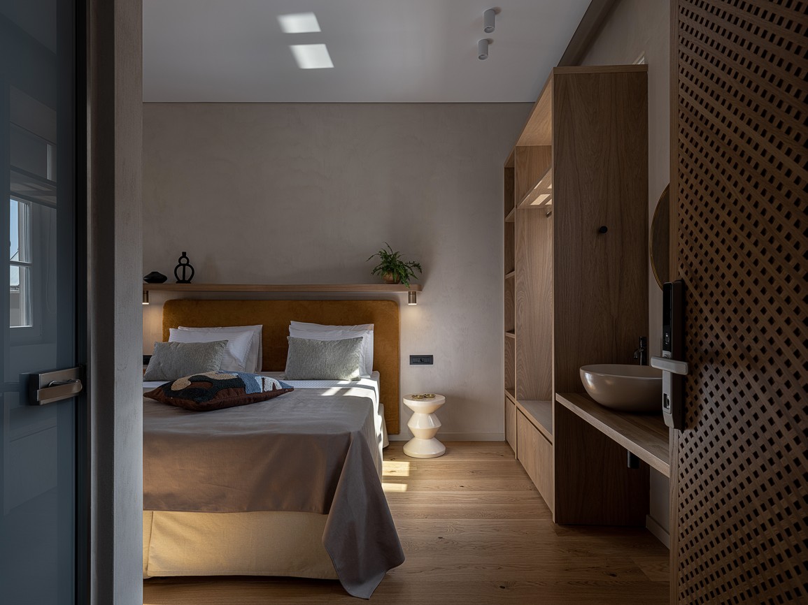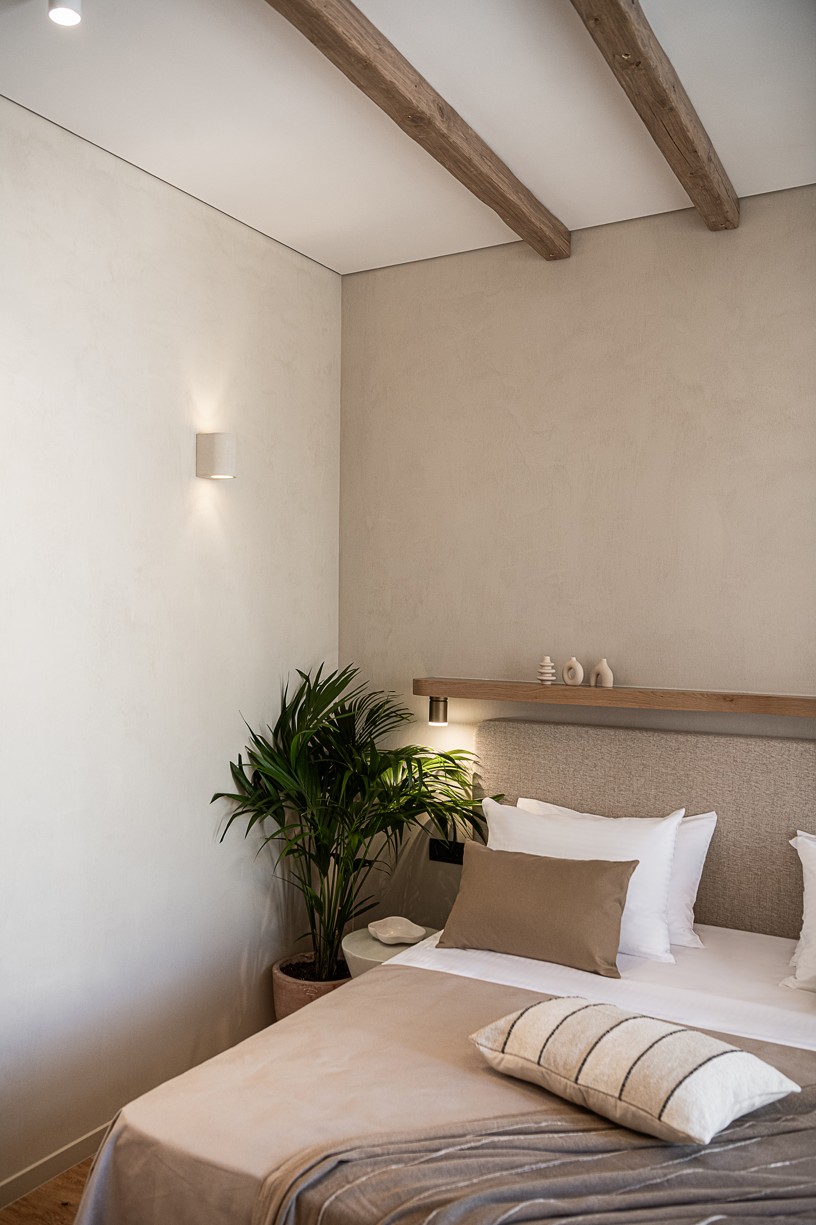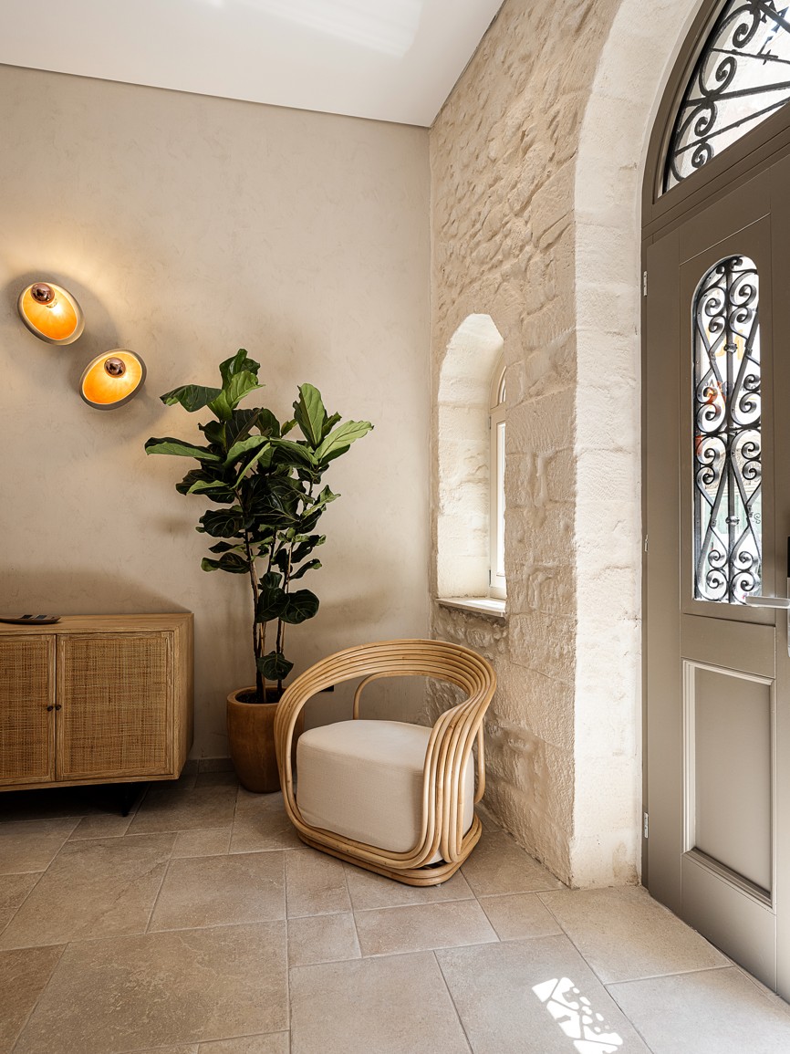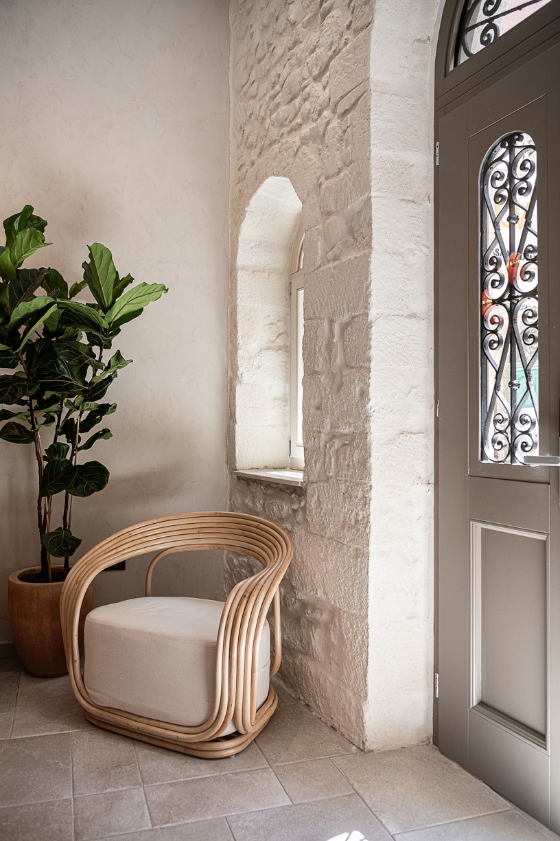 Casa Modiano thoughtful renovation and material selection – combining reuse of old elements , soft wooden details, neutral style furniture, blank walls and sleek stone tiles – successfully expresses both the building memory, and its current use.