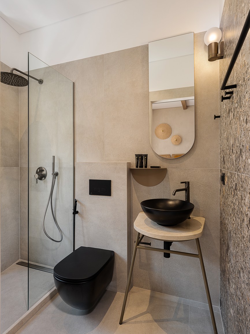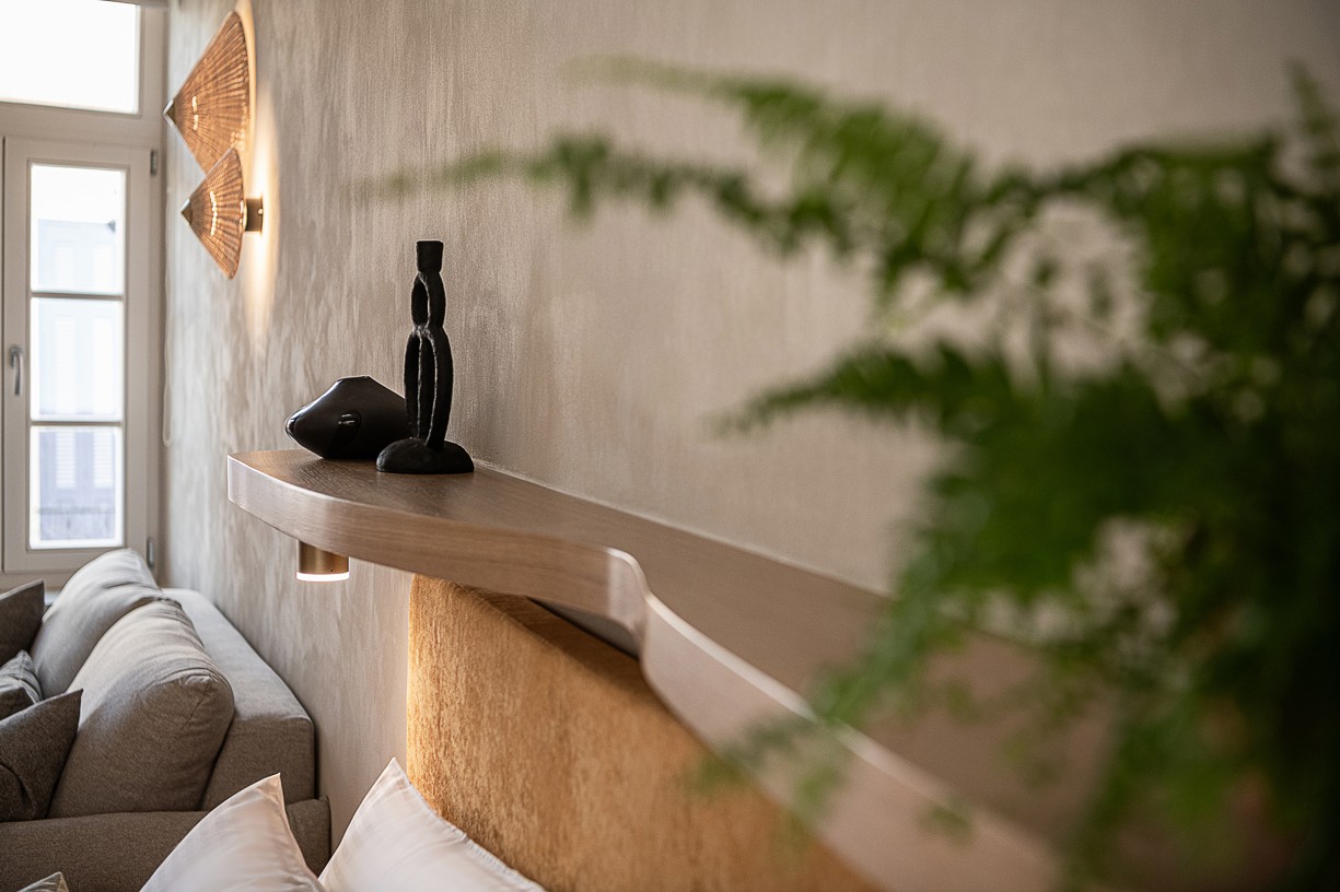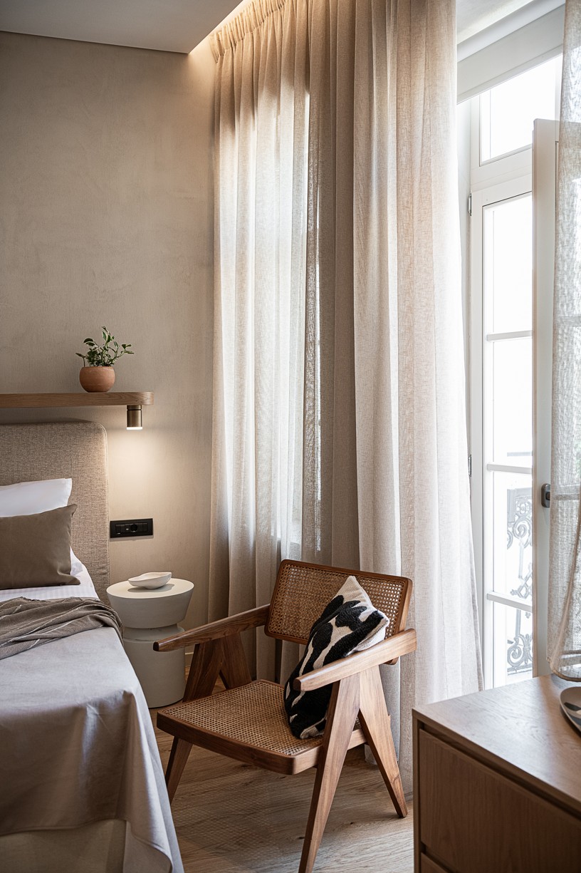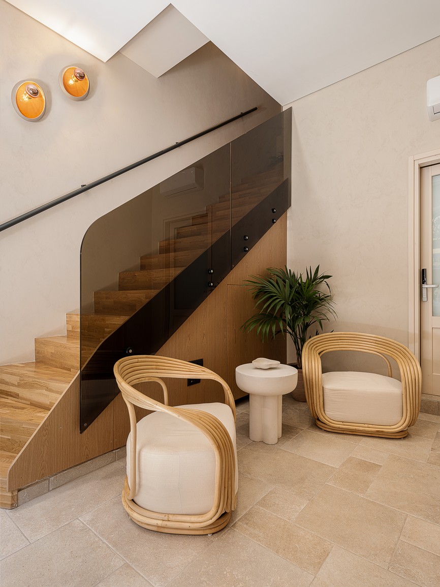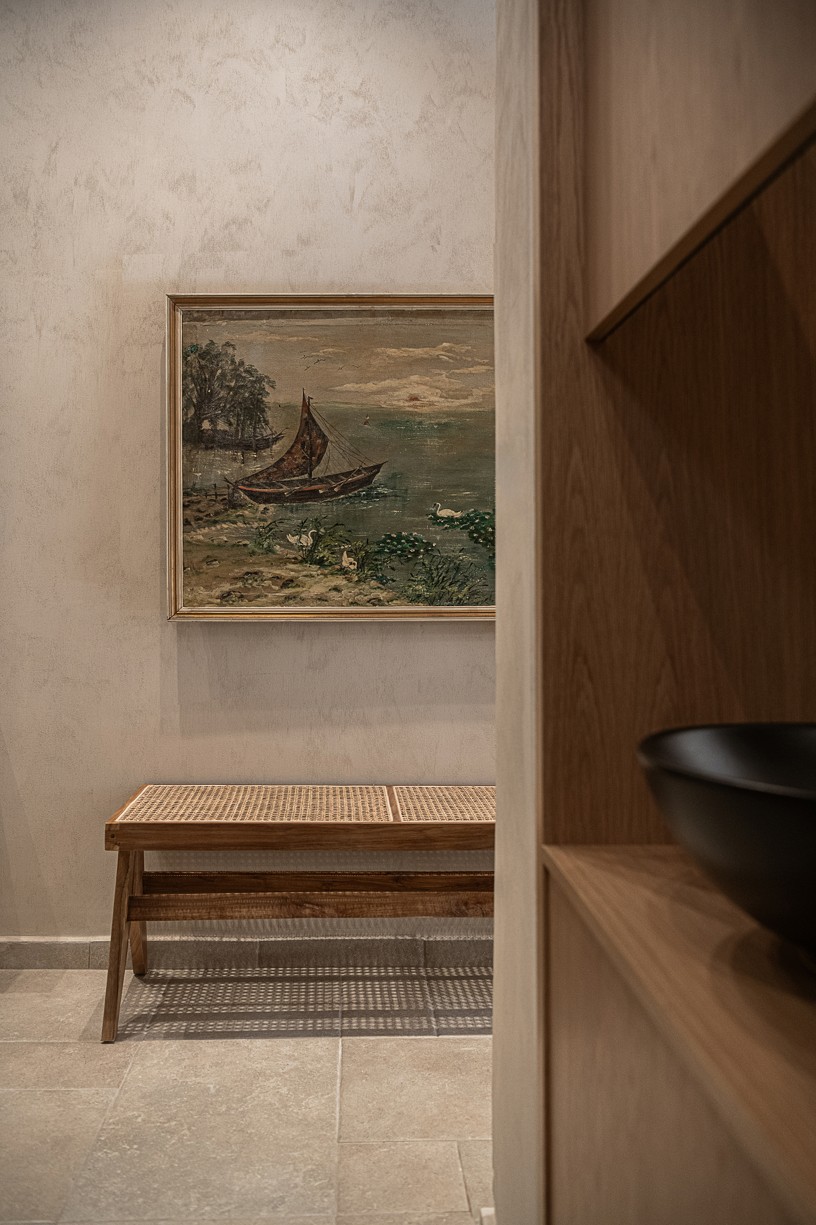 Casa Modiano thoughtful renovation and material selection – combining reuse of old elements , soft wooden details, neutral style furniture, blank walls and sleek stone tiles – successfully expresses both the building memory, and its current use.