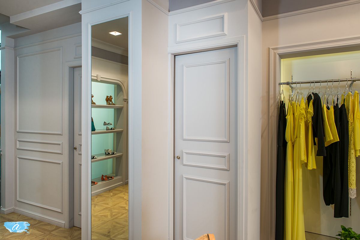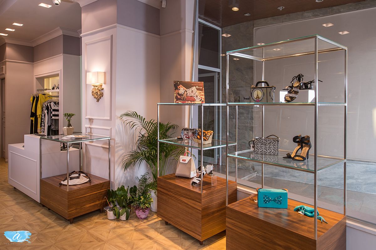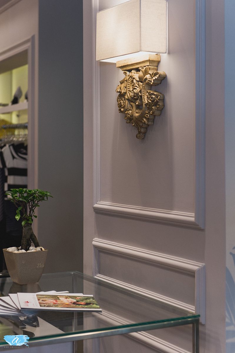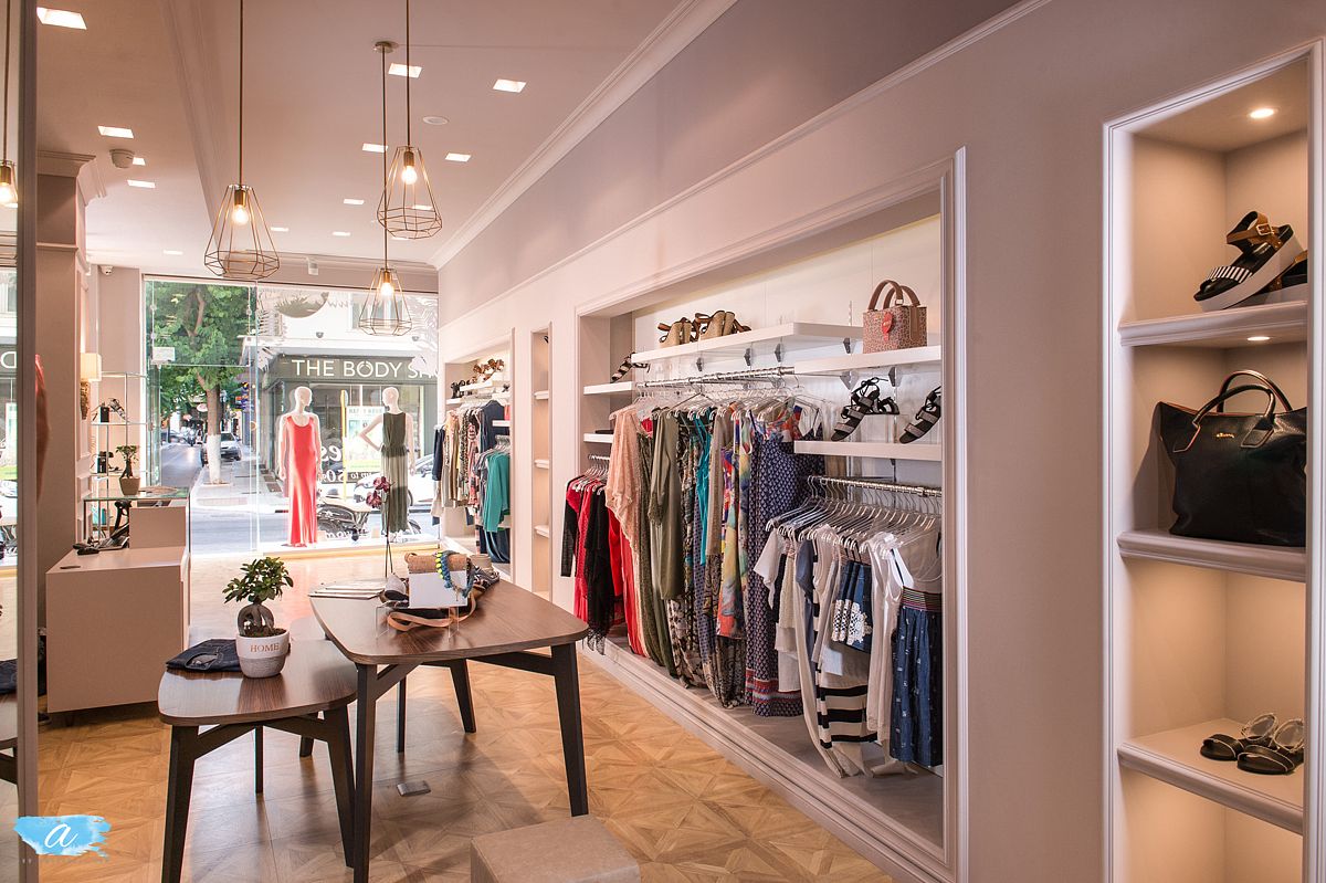 Χρησιμοποιήθηκαν πάλ χρώματα στους τοίχους οι οποίοι διακοσμήθηκαν με γύψινες κλασσικές κορνίζες βαμμένες στο χρώμα του τοίχου, χρυσά φωτιστικά και σκαλιστές ξύλινες απλίκες οι οποίες προσδίδουν ένα ύφος κομψό και αριστοκρατικό. Οι καθρέπτες ενσωματώθηκαν στις γύψινες κορνίζες και οι πόρτες των δοκιμαστηρίων ακολούθησαν το ύφος αυτό ώστε να συνυπάρχουν αρμονικά. Στη μέση του χώρου τοποθετήθηκαν τρία τραπέζια διαφορετικού μεγέθους και ύψους όπου προβάλλονται διπλωμένα ρούχα και αξεσουάρ.