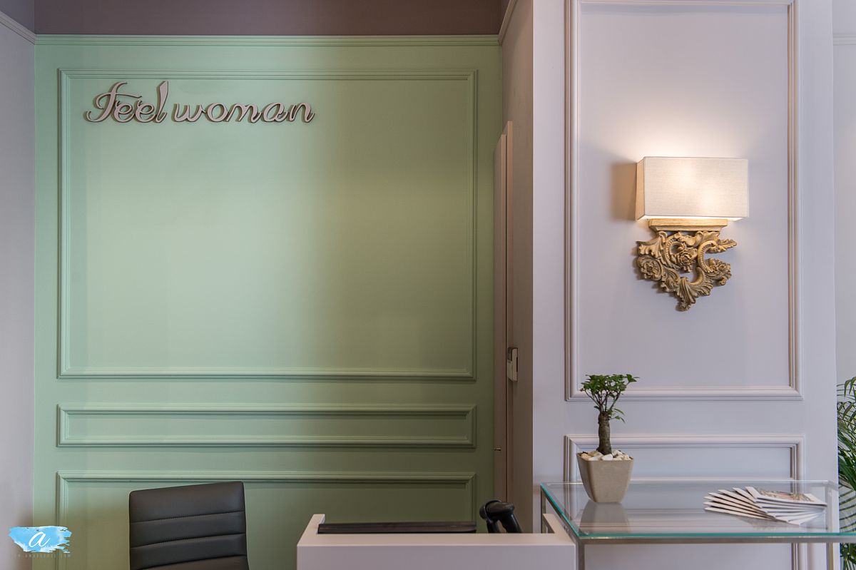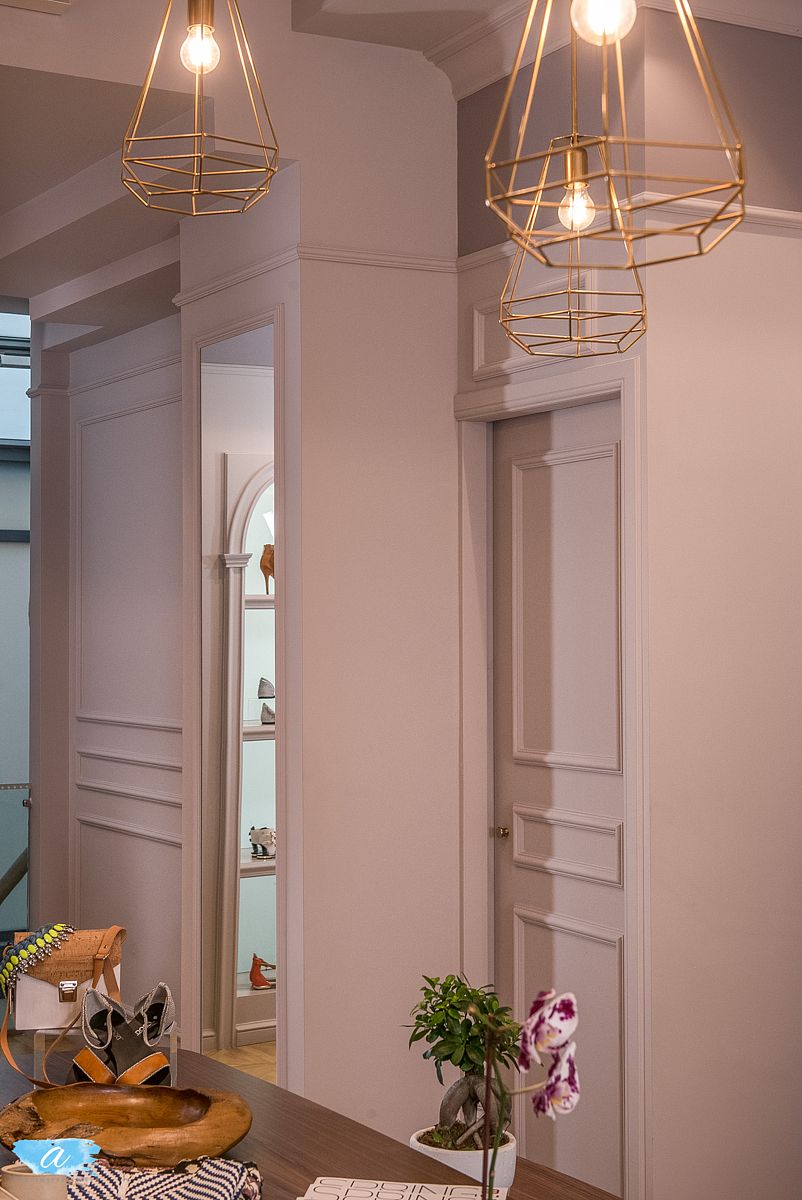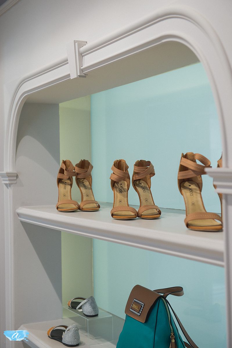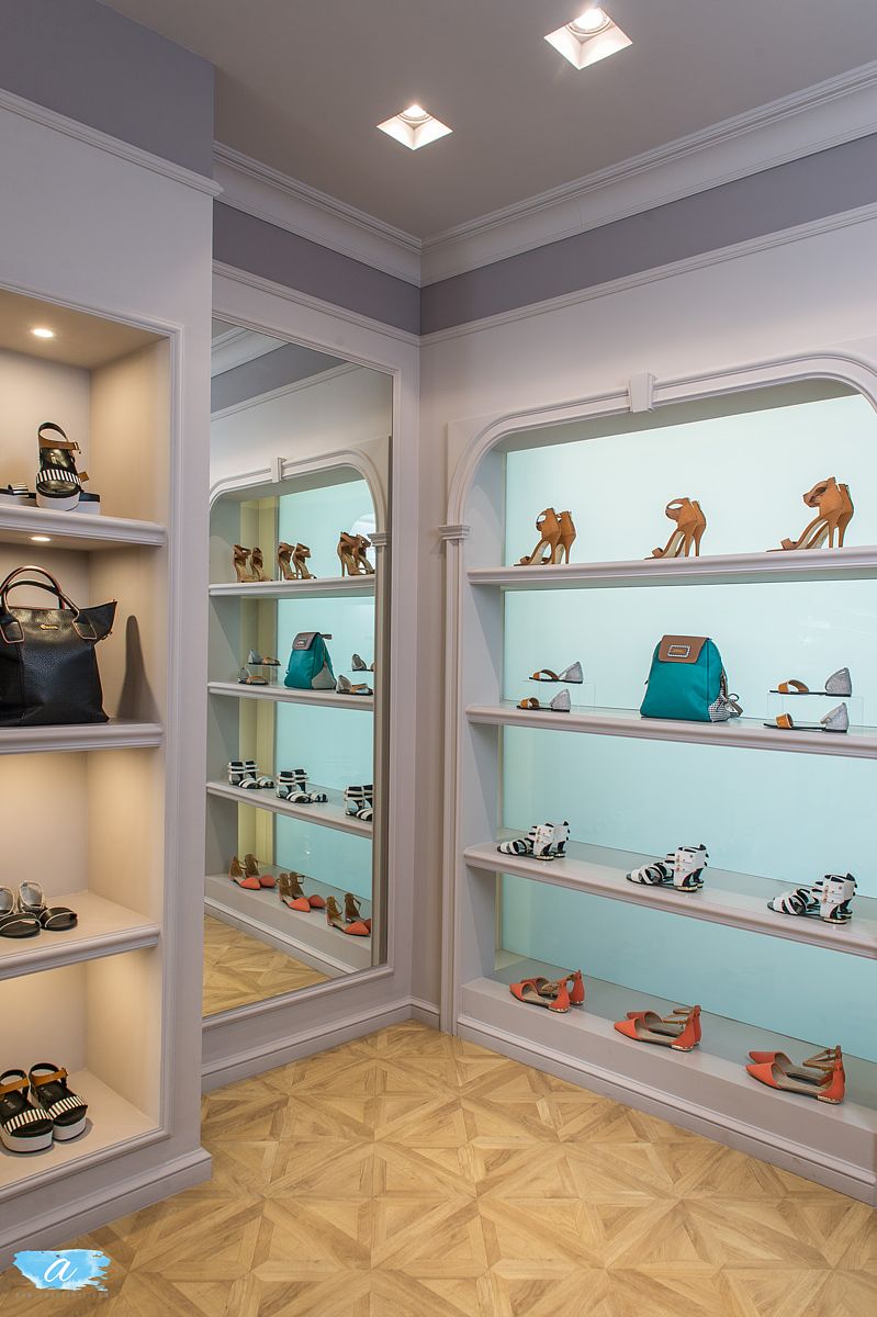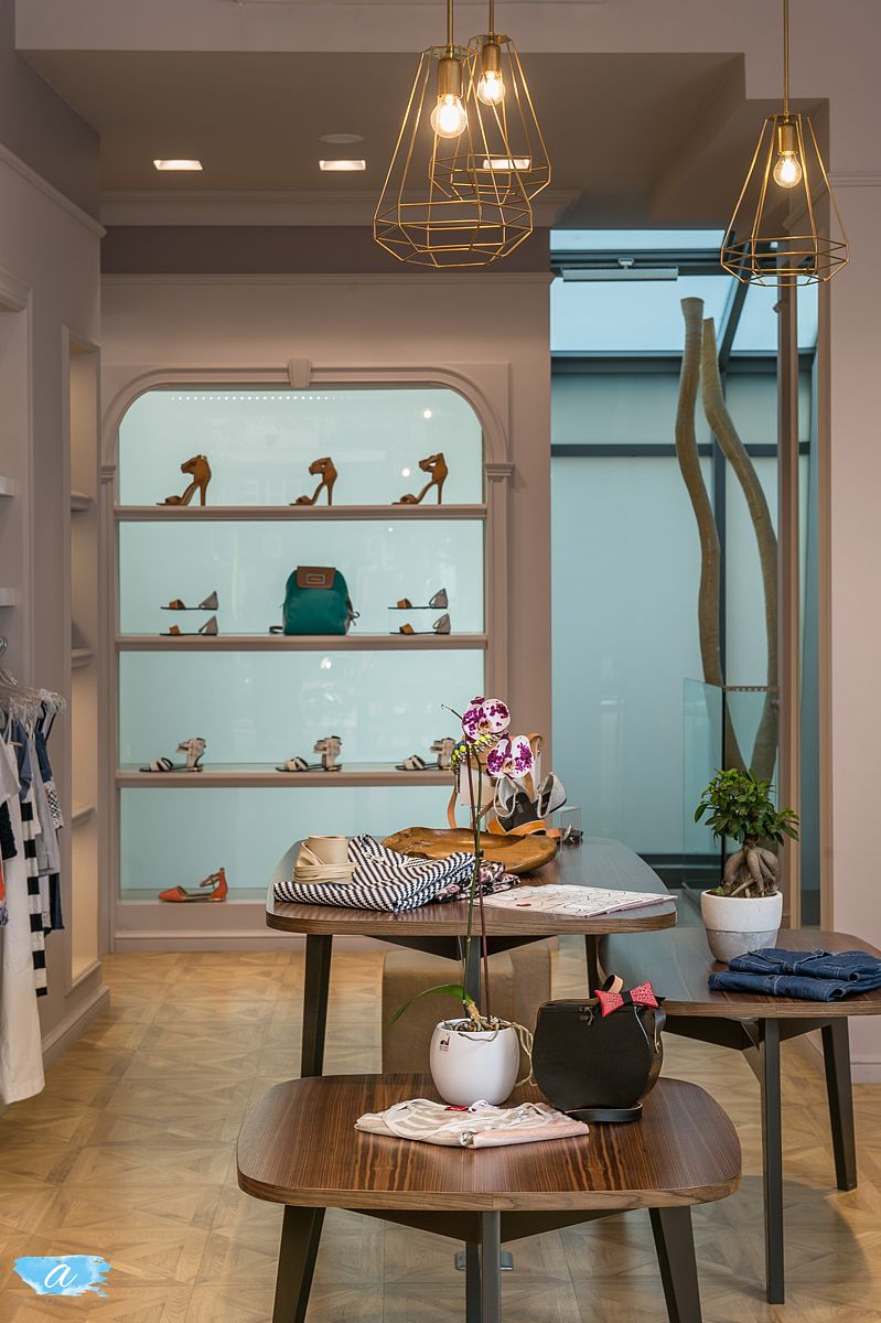 Χρησιμοποιήθηκαν πάλ χρώματα στους τοίχους οι οποίοι διακοσμήθηκαν με γύψινες κλασσικές κορνίζες βαμμένες στο χρώμα του τοίχου, χρυσά φωτιστικά και σκαλιστές ξύλινες απλίκες οι οποίες προσδίδουν ένα ύφος κομψό και αριστοκρατικό. Οι καθρέπτες ενσωματώθηκαν στις γύψινες κορνίζες και οι πόρτες των δοκιμαστηρίων ακολούθησαν το ύφος αυτό ώστε να συνυπάρχουν αρμονικά. Στη μέση του χώρου τοποθετήθηκαν τρία τραπέζια διαφορετικού μεγέθους και ύψους όπου προβάλλονται διπλωμένα ρούχα και αξεσουάρ.