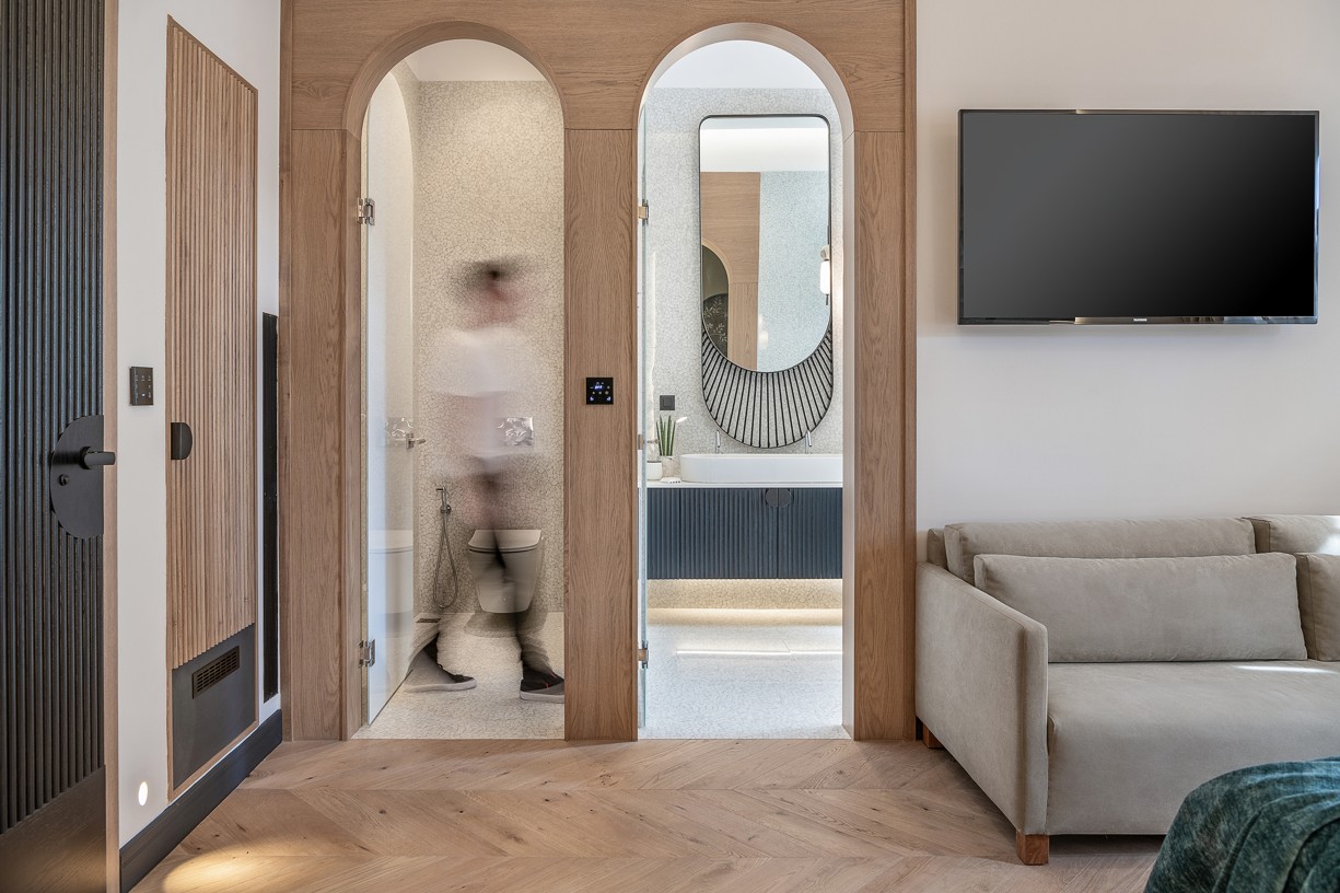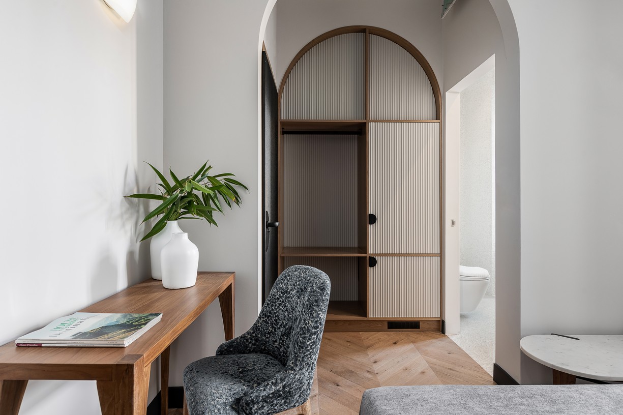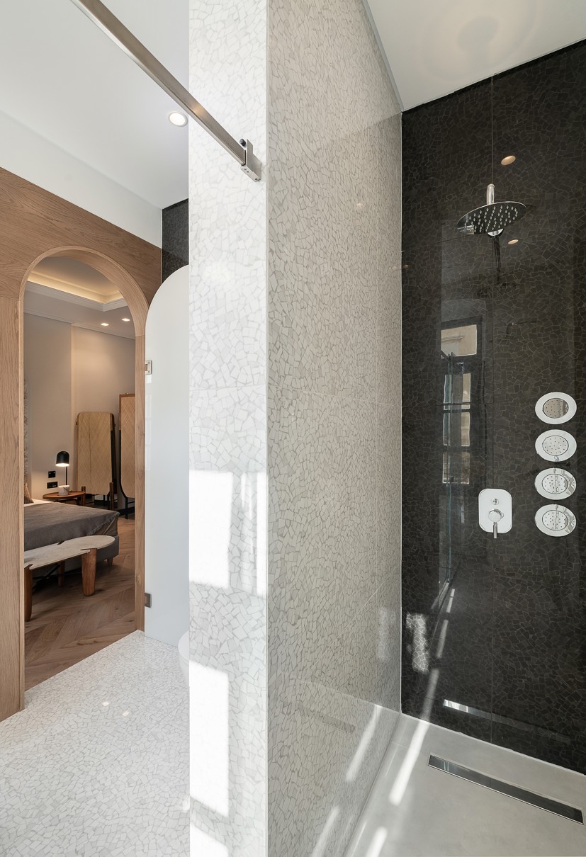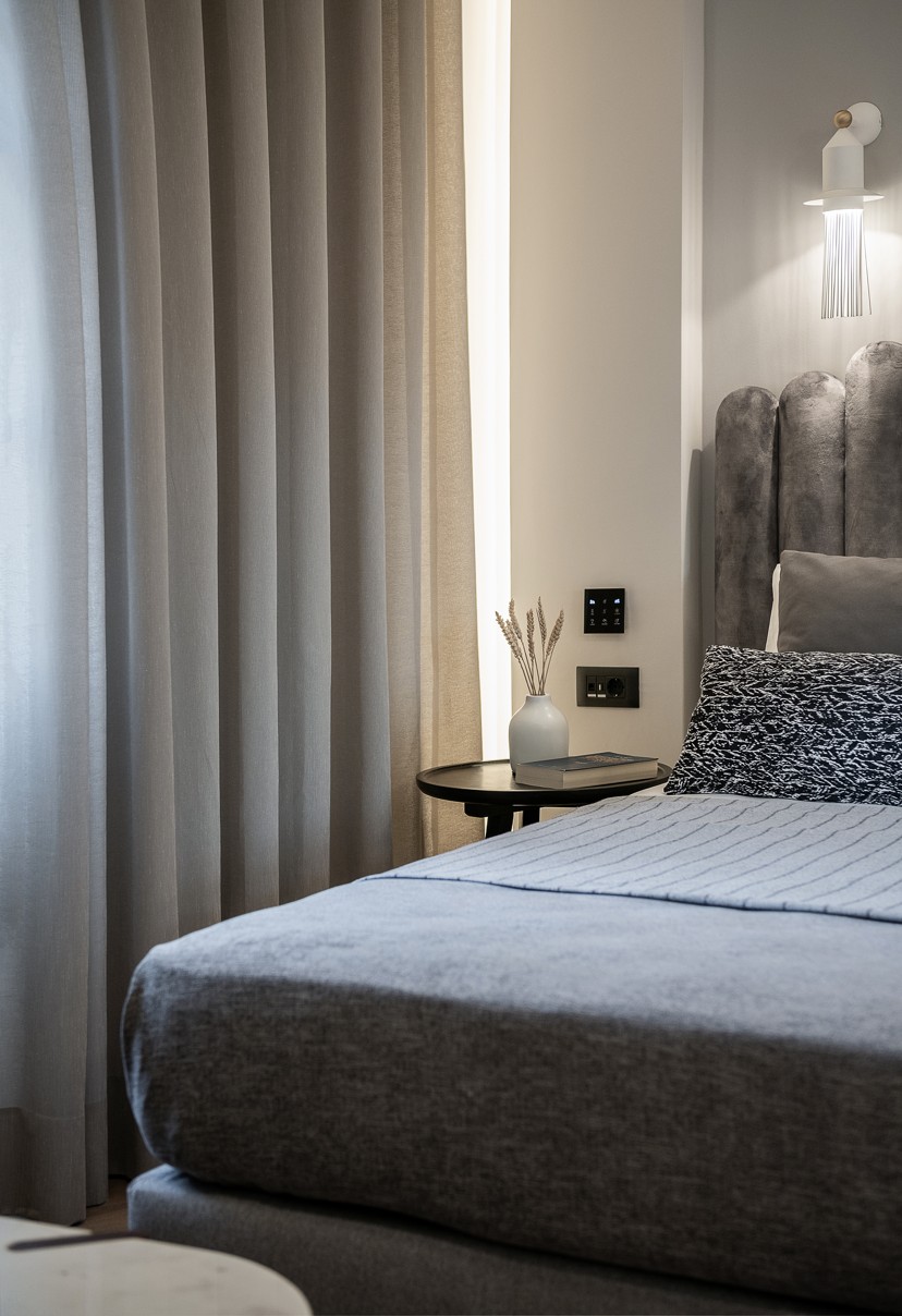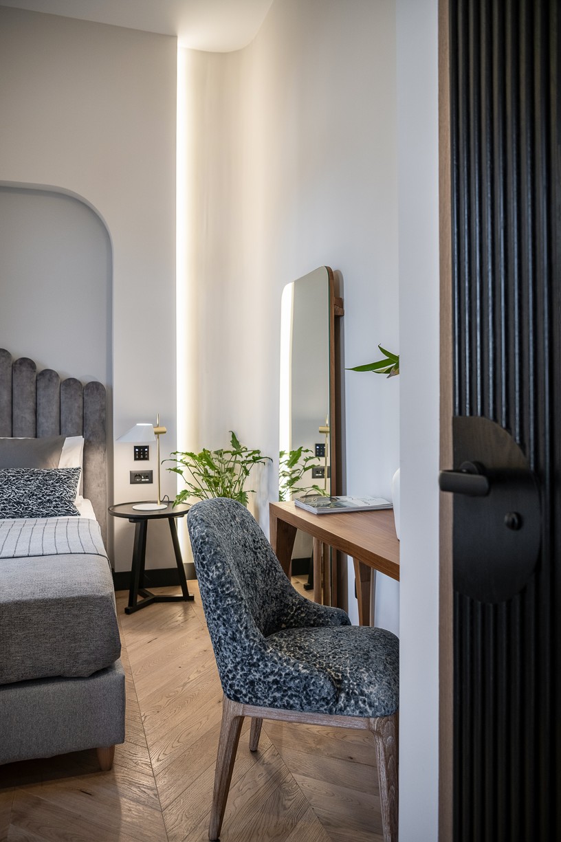 Ένας έξυπνος σχεδιασμός στην κυκλοφορία των δωματίων και των μπάνιων σε συνδυασμό με μια ιστορικού ύφους παλέτα χρωμάτων και υλικών δίνουν στο ξενοδοχείο την ευελιξία που χρειάζεται για να προσεγγίσει ένα ευρύ κοινό. Κάθε δωμάτιο έχει σχεδιαστεί με ιδιαίτερη φιλοσοφία που να εναρμονίζεται με τα υπάρχοντα ανοίγματα του κτηρίου αλλά και του φωτισμού που αυτά έχουν ανάλογα με την κίνηση του ήλιου. Στα πιο φωτεινά και μεγάλα δωμάτια έχει επιλεγεί μια πιο σκούρα παλέτα χρωμάτων και υλικών και αντίστοιχα στα πιο μικρά, ουδέτερα χρώματα με ελάχιστα έντονα στοιχεία. Οι απαλές εναλλαγές στους χρωματισμούς των δωματίων τονίζονται με έναν ιδιαίτερο τρόπο με το μαύρο σοβατεπί και μαύρες λεπτομέρειές σε πρίζες και φωτιστικά. Όλοι οι χώροι του ξενοδοχείου φιλοξενούν μια design συλλογή επίπλων που σχεδιάστηκαν από το γραφείο μας ειδικά για το Malmos Historic Hotel, καθώς και επιλεγμένα επώνυμα έπιπλα και φωτιστικά.
