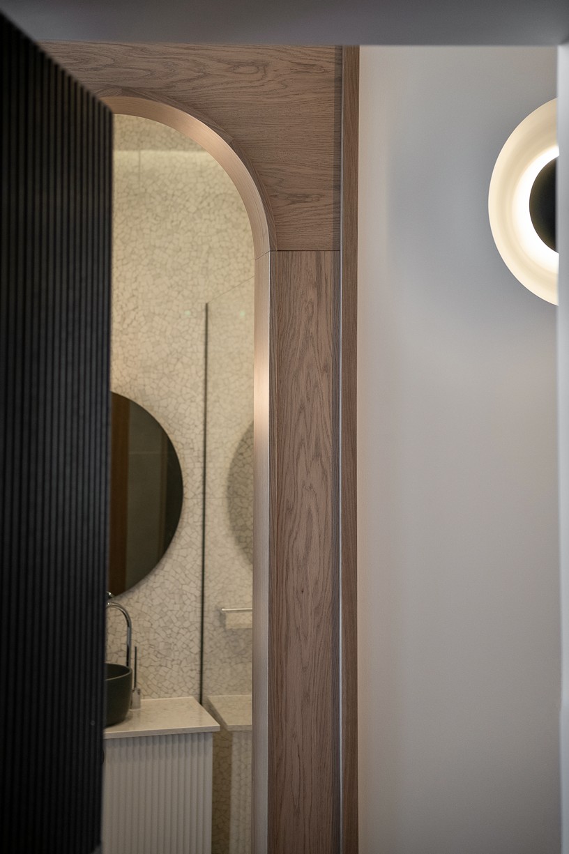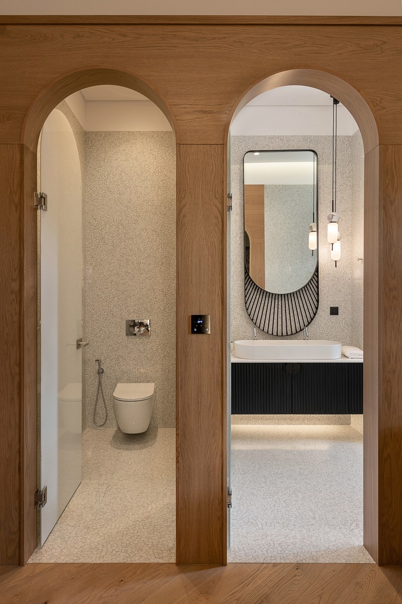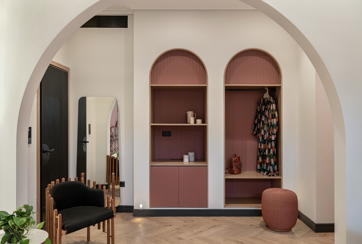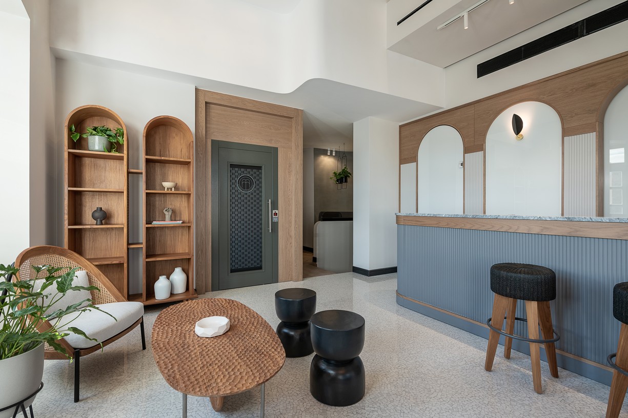 Στον χώρο της reception συναντάμε στους τοίχους καμπύλες που προκύπτουν από τα γραφικά του λογότυπου αλλά και από το σχήμα της ενετικής καμάρας. Τα σχήματα αυτά βρίσκονται σε μια παράθεση ώστε άλλοτε να δημιουργούν ανοίγματα σε λειτουργικούς χώρους και άλλοτε απλές εσοχές για φωτισμό. Η φιλοσοφία της καμάρας έχει περάσει σχεδόν στο σύνολο του σχεδιασμού, στα φωτιστικά και στα έπιπλα. Βελούδινα καθίσματα, φυτά και ατμοσφαιρικός φωτισμός δημιουργούν μια χαλαρή και φιλική ατμόσφαιρα που γοητεύει του επισκέπτες σε ένα θερμό καλωσόρισμα.