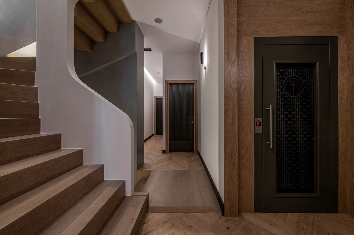 Το κλιμακοστάσιο επανασχεδιάστηκε στα χνάρια της αρχικής ξύλινης σκάλας και με αντίστοιχες γραμμές και κάθετους φωτισμούς τονίστηκε το καμπυλωτό της σχήμα με σκοπό να δημιουργηθεί μια ζωντανή παλμική αίσθηση καθώς ανεβαίνουμε προς την reception.
