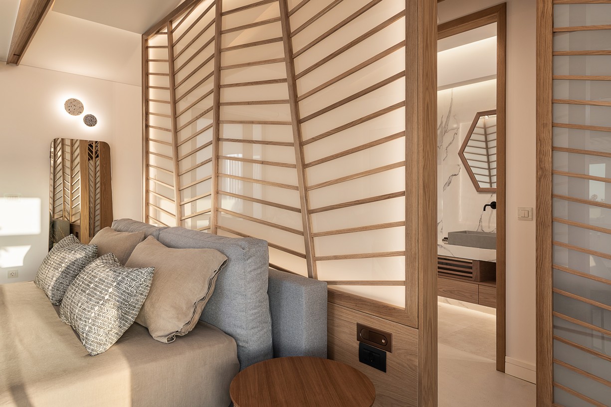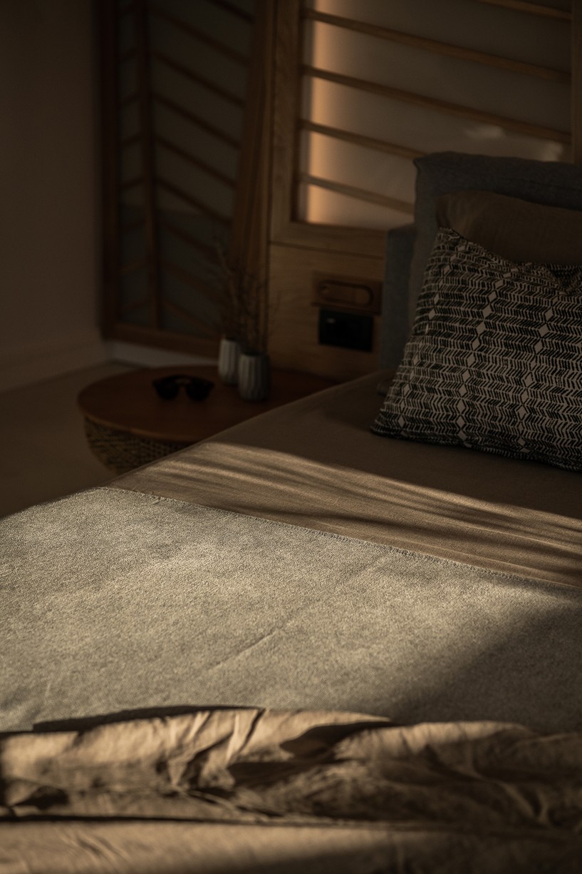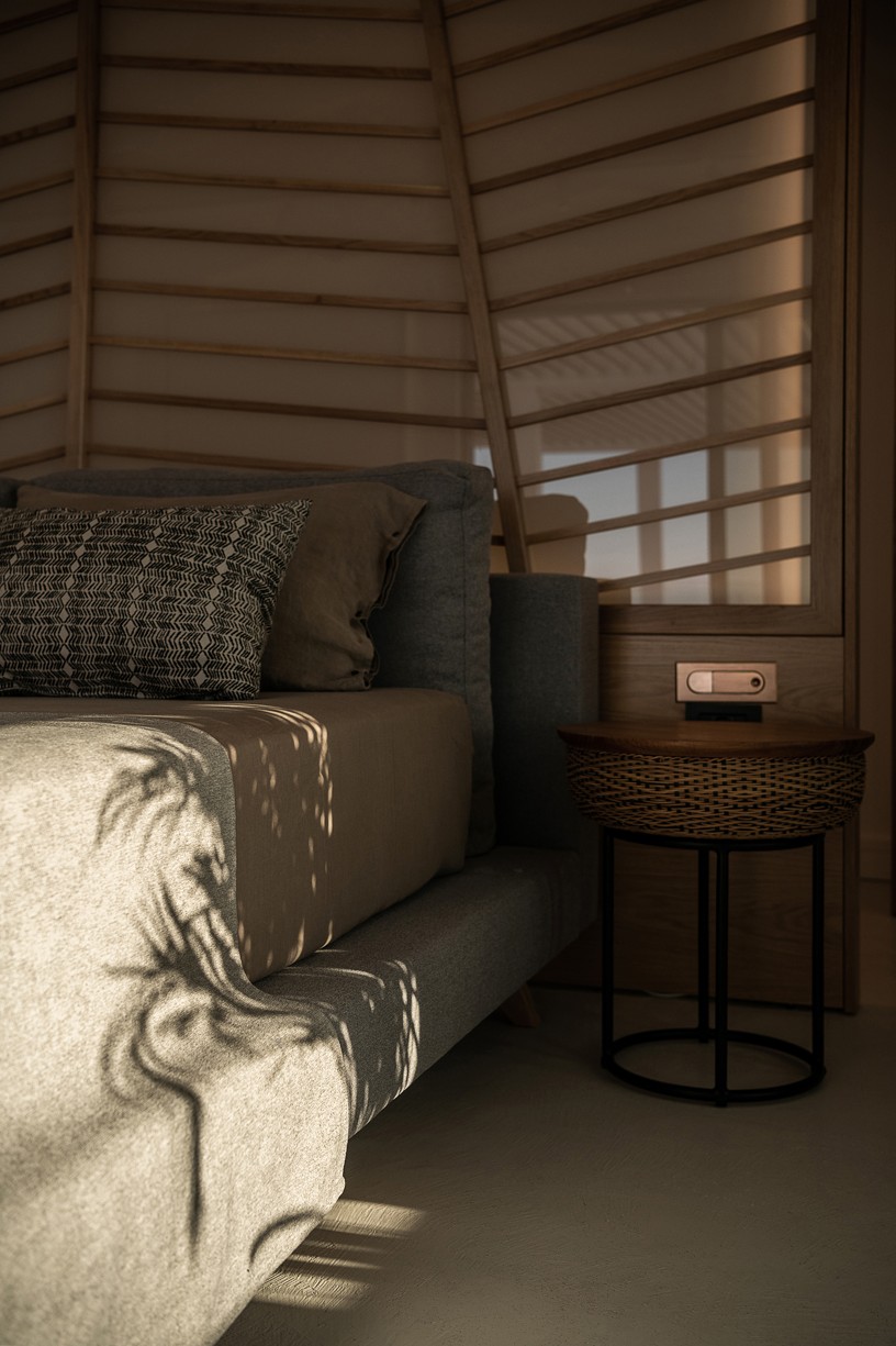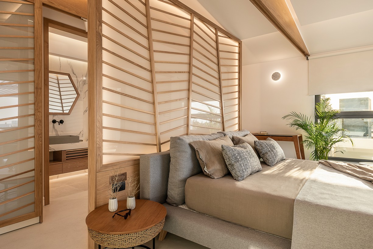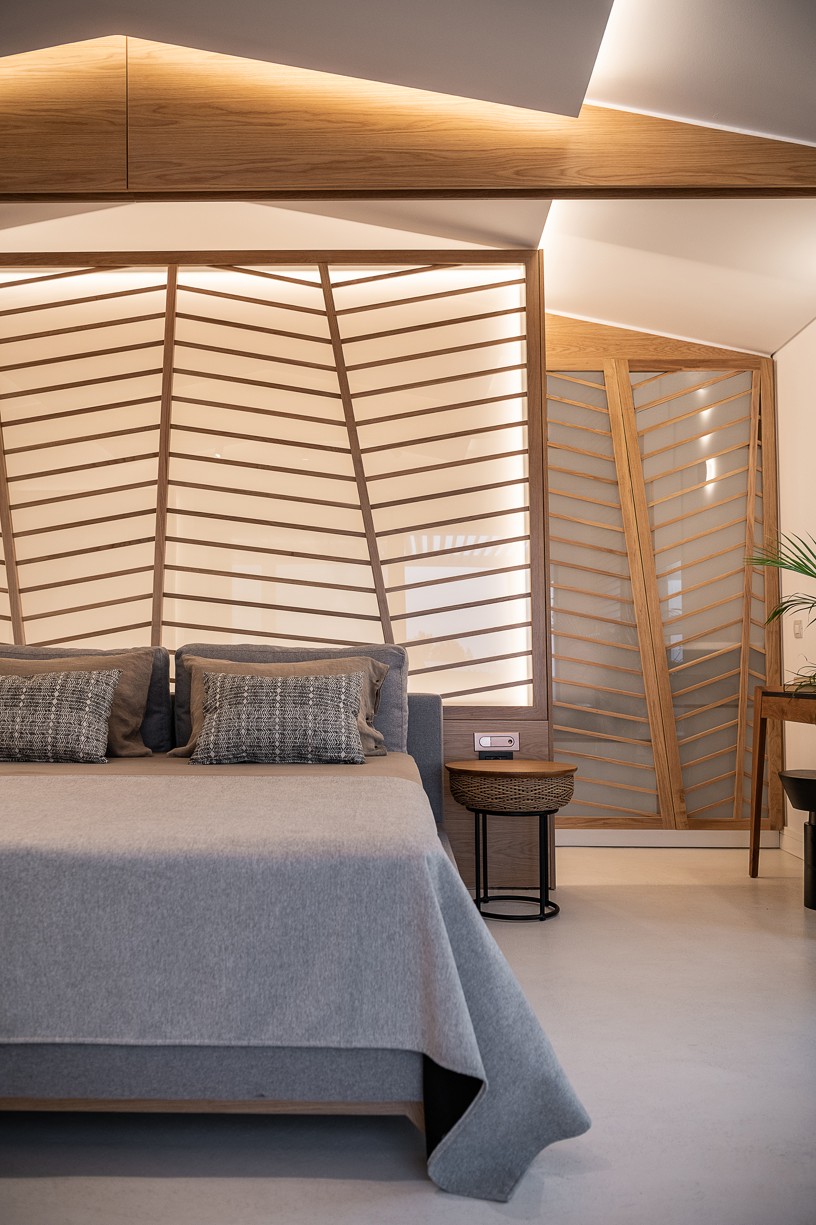 The design of this hotel suite aims to maximize the sense of the big space by setting the bed as center stage of the room. The circulation is defined by the bed and the rest of the functions take place around it. The structure has simple, essential lines increased by wooden details and bevel levels from the roof. Our goal was to create an intimate space via a warm color pallet. This personality will be extended to the hotel’s common area to create a unified whole.