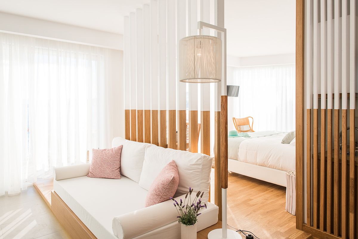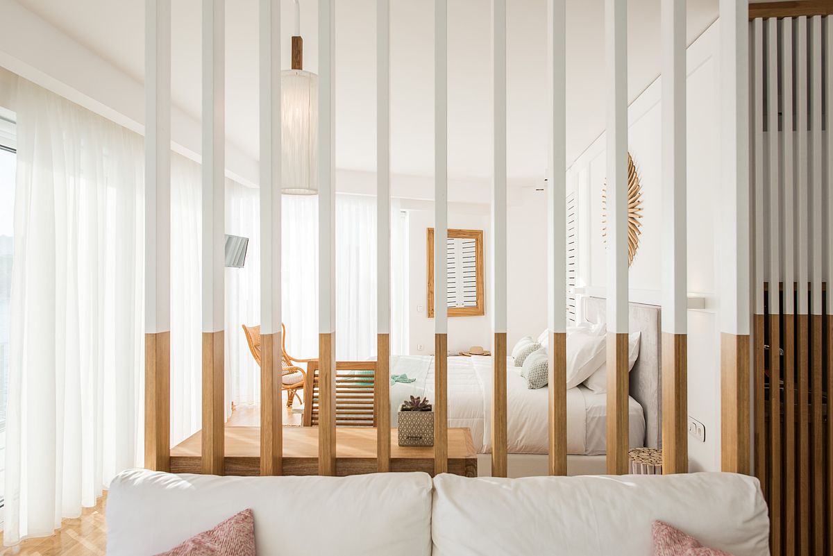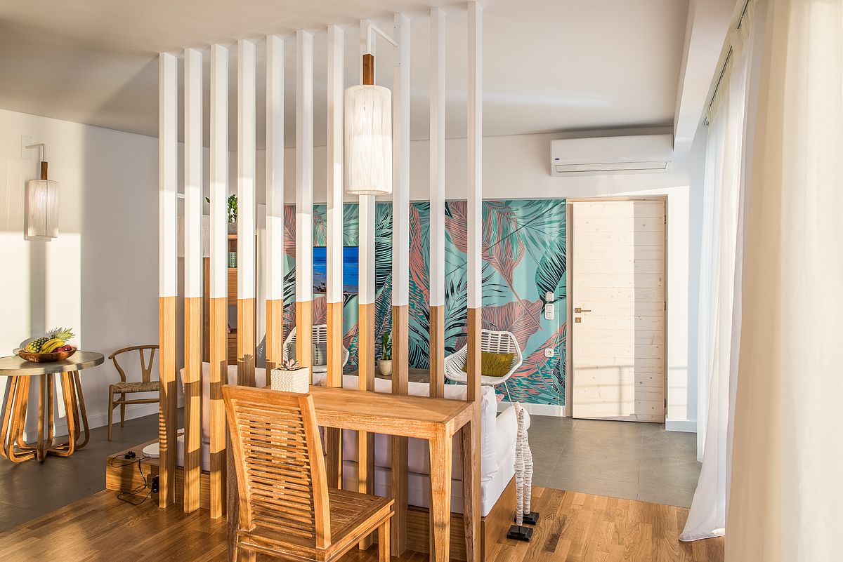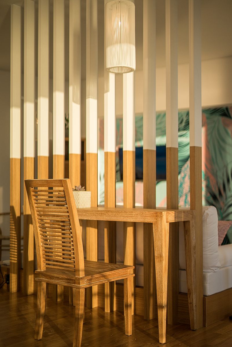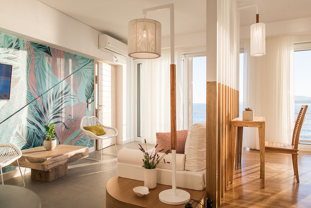 Με επίκεντρο την ανεμπόδιστη θέα, το διαμέρισμα επιτρέπει από οποιοδήποτε σημείο του να υπάρχει οπτική επαφή με την θάλασσα. Η κυκλοφορία στο εσωτερικό γίνεται γύρω από ένα διάτρητο διαχωριστικό το οποίο είναι παράλληλα και η πλάτη του καναπέ, ενώ οι περισσότερες λειτουργίες του χώρου είναι τοποθετημένες στην κλειστή πλευρά του κτηρίου. Από την εναλλαγή εξωτικών στοιχείων και υλικών σε απλές φόρμες με απαλούς χρωματισμούς προκύπτει ένα ανάλαφρο Καλοκαιρινό σκηνικό, ιδανικό για διακοπές δίπλα στην παραλία του Κουμ Καπί.