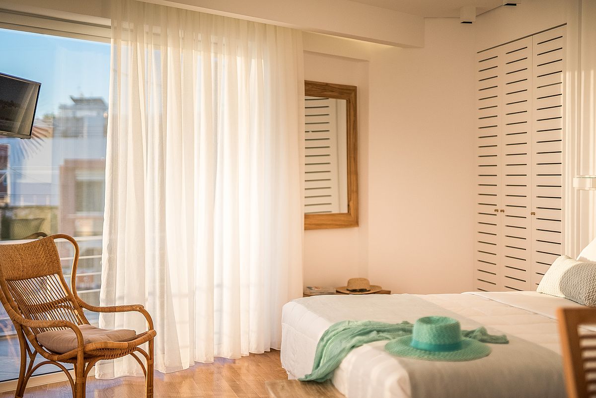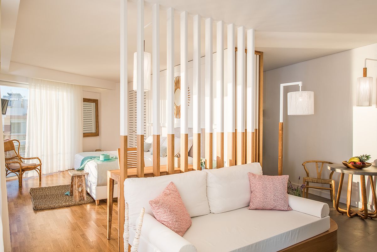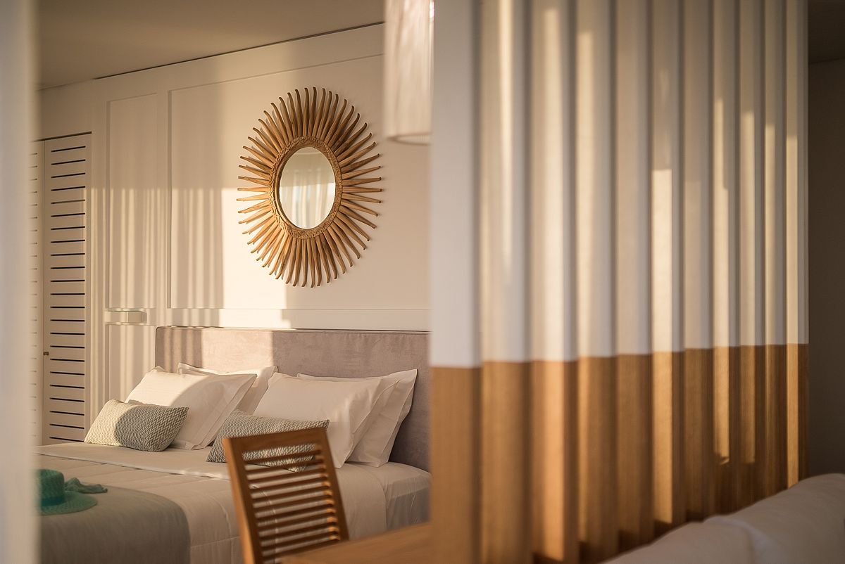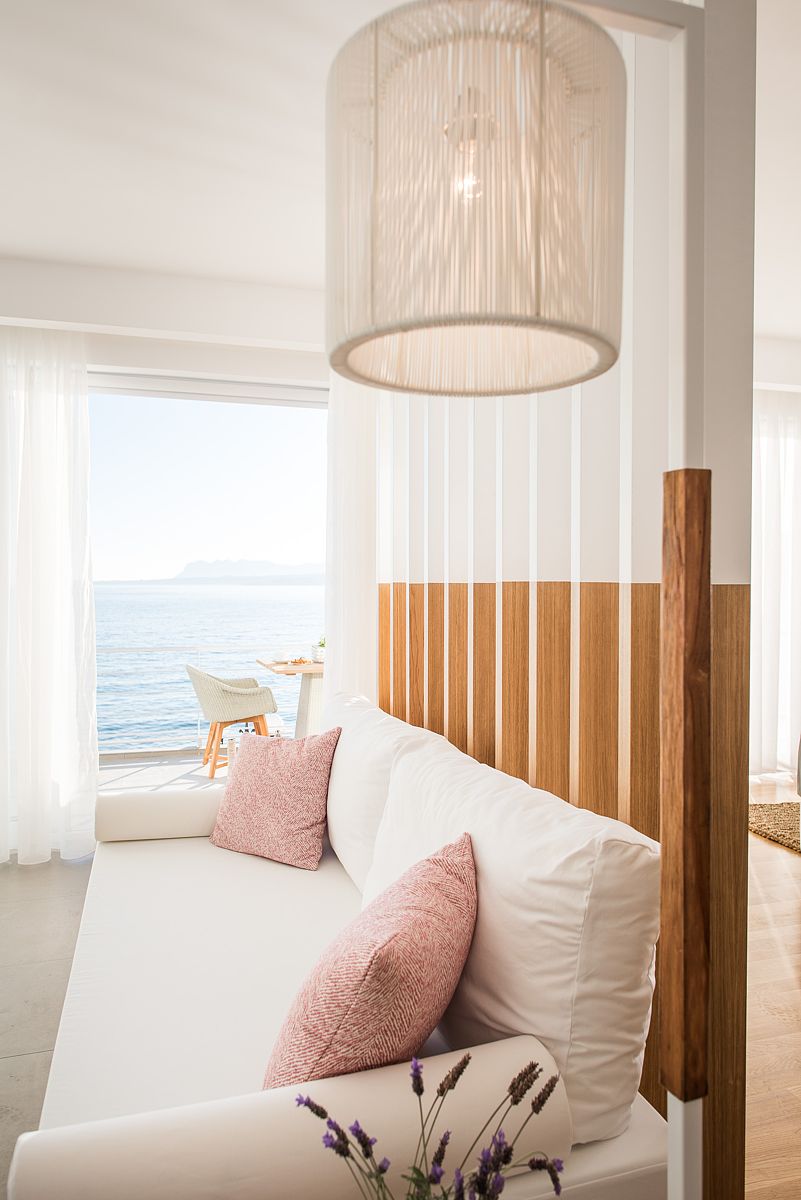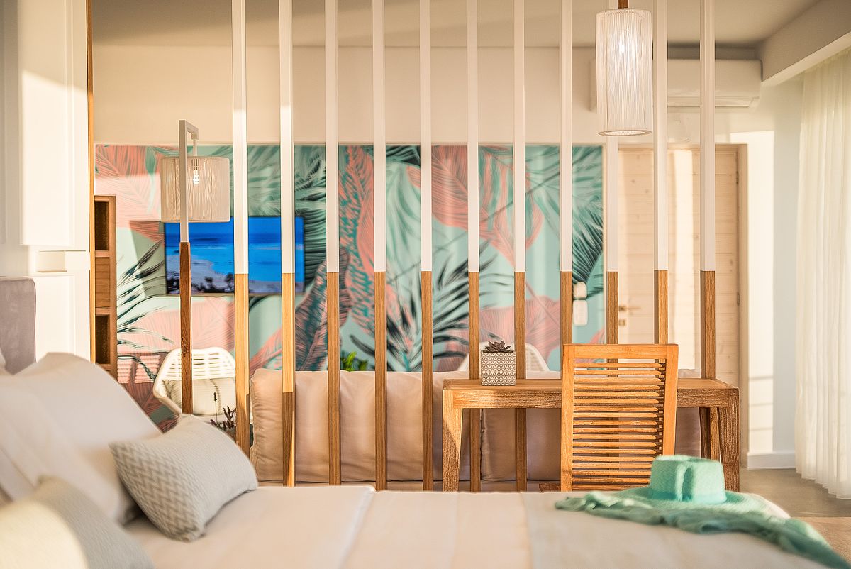 Με επίκεντρο την ανεμπόδιστη θέα, το διαμέρισμα επιτρέπει από οποιοδήποτε σημείο του να υπάρχει οπτική επαφή με την θάλασσα. Η κυκλοφορία στο εσωτερικό γίνεται γύρω από ένα διάτρητο διαχωριστικό το οποίο είναι παράλληλα και η πλάτη του καναπέ, ενώ οι περισσότερες λειτουργίες του χώρου είναι τοποθετημένες στην κλειστή πλευρά του κτηρίου. Από την εναλλαγή εξωτικών στοιχείων και υλικών σε απλές φόρμες με απαλούς χρωματισμούς προκύπτει ένα ανάλαφρο Καλοκαιρινό σκηνικό, ιδανικό για διακοπές δίπλα στην παραλία του Κουμ Καπί.