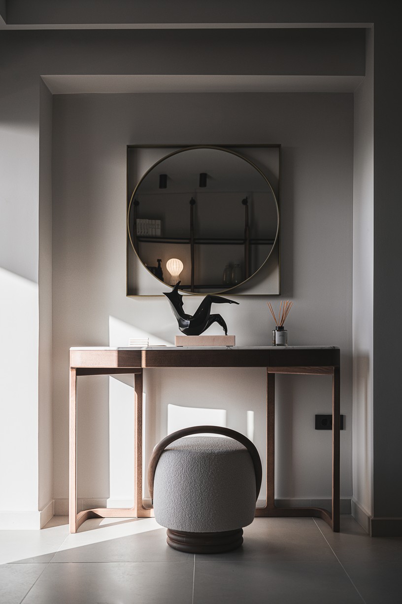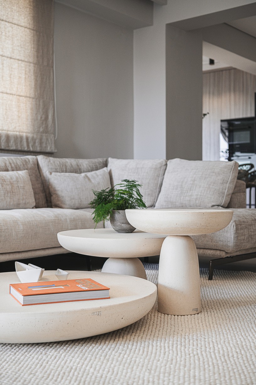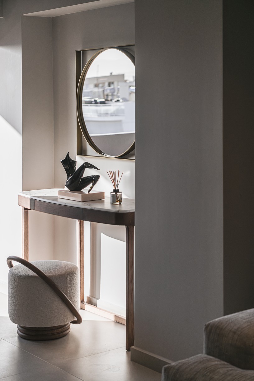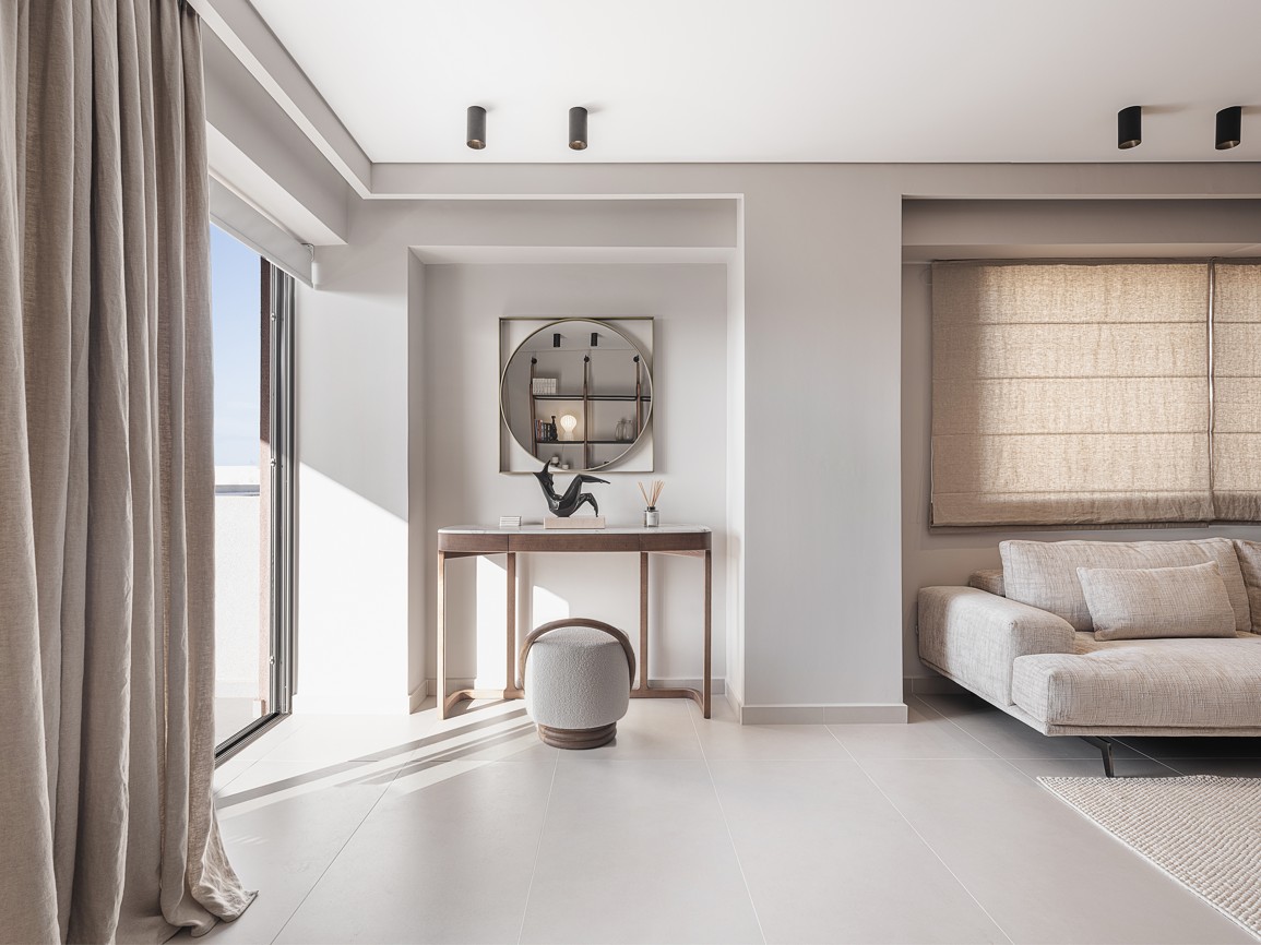 The sitting room features a beige fabric covered sofa by Papadatos. Coffee tables from Mogg,a wall console by Porada and mirror by Sovet. In front of the balcony door there is a Jupiter armchair byArketipo and a Tab floor lamp by Flos.